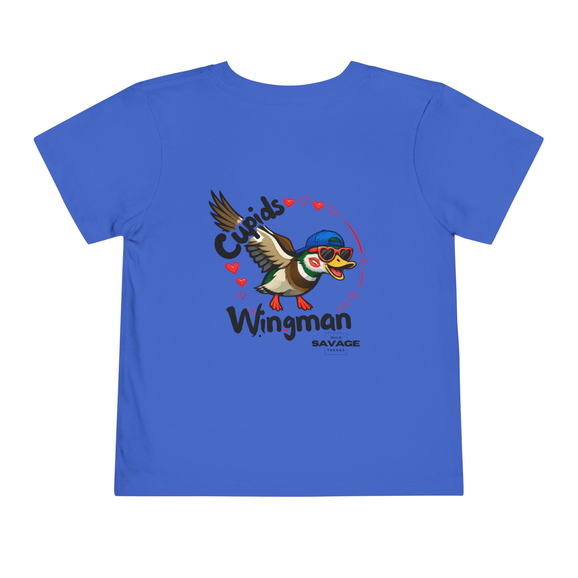A soft, lightweight toddler tee that brings playful charm to everyday adventures. The small front chest illustration and larger, colorful back print show a mischievous “Cupid’s Wingman” duck in a cap and sunglasses — wings mid-flap, hearts trailing behind. The shirt feels breathable on active little ones, with smooth combed cotton and a tear-away label for easy comfort. It sits simply in the wardrobe but stands out during playdates, family outings, and cozy home days when a little attitude and a lot of fun are welcome.