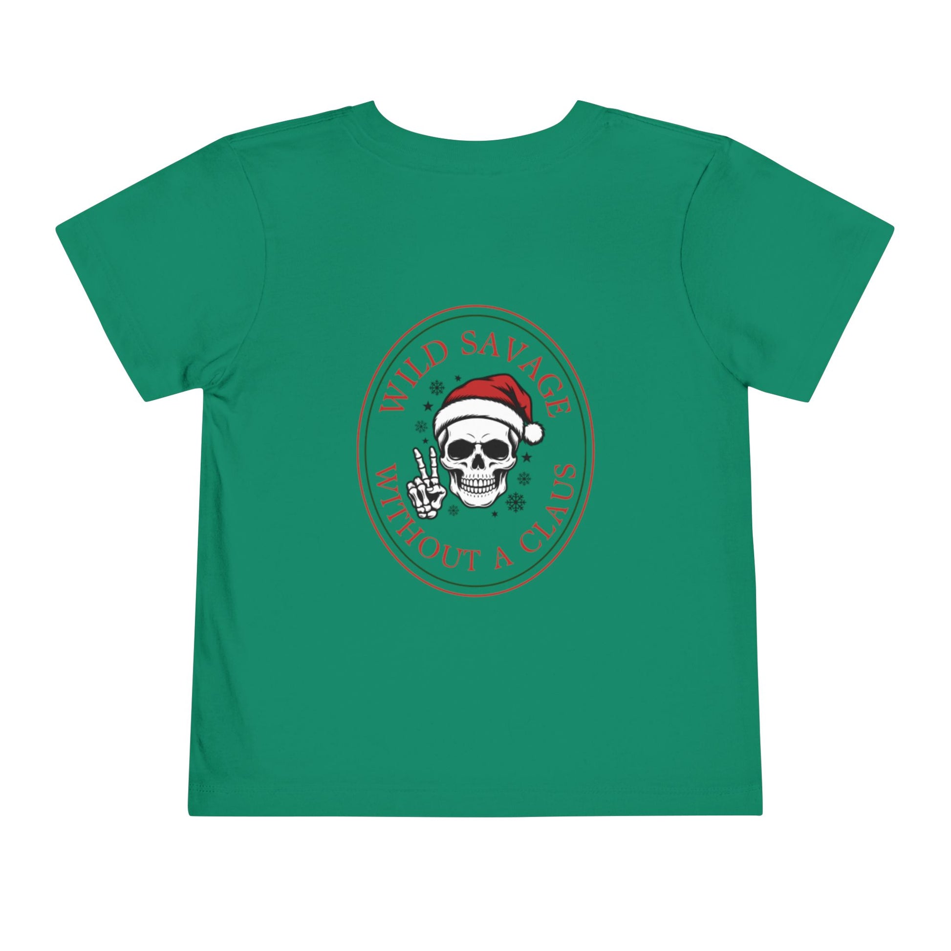 Soft, lightweight toddler tee designed for little rebels who love a cheeky edge. The front features a tiny skull in a Santa hat for subtle mischief, while the back shows the same skull inside a vintage oval stamp reading “WILD SAVAGE WITHOUT A CLAUS.” Short sleeves and a relaxed cut let busy toddlers move freely — crawling, climbing, and cozying up at storytime. The breathable cotton blend keeps them cool during holiday playdates and calm on neighborhood walks. This shirt feels gentle on sensitive skin and wears well through washes, bringing a playful, slightly punk twist to seasonal moments and everyday adventures.